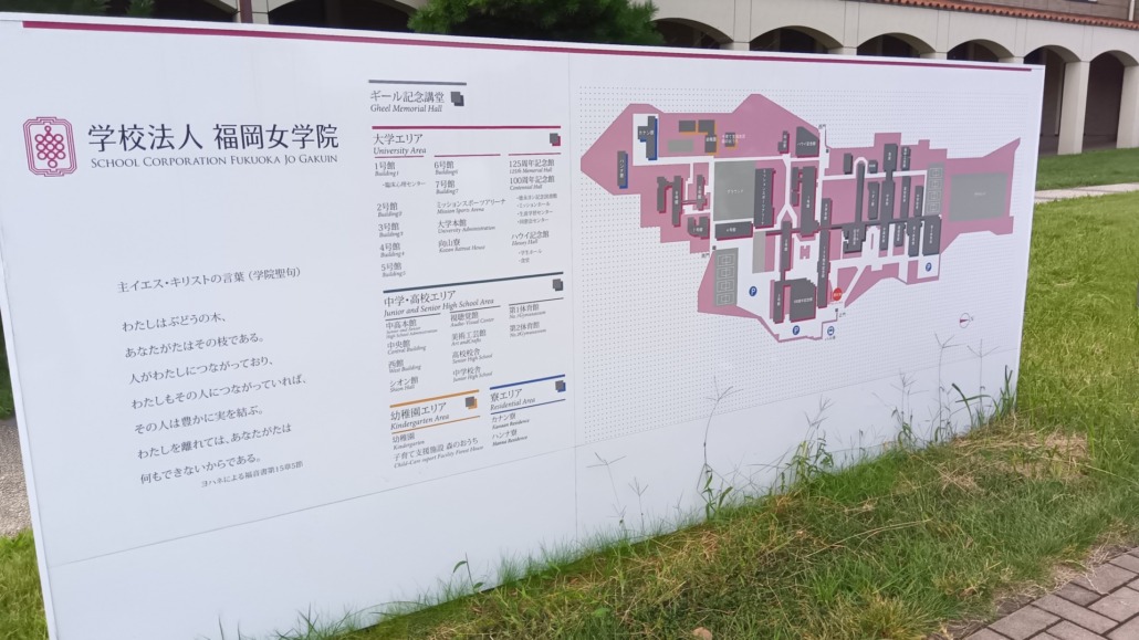 明治時代から140年続くミッションスクールは、福岡英和女学校としてスタート。校内案内図に「キリストはぶどうの木」の一節が書かれていた。みんながつながっている。